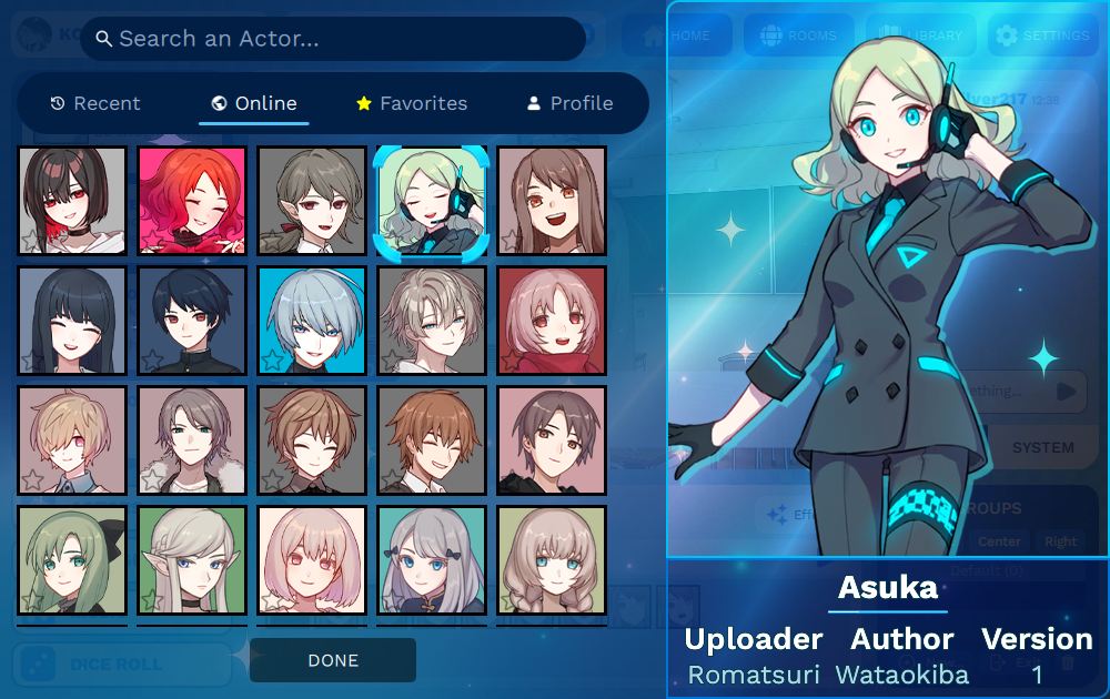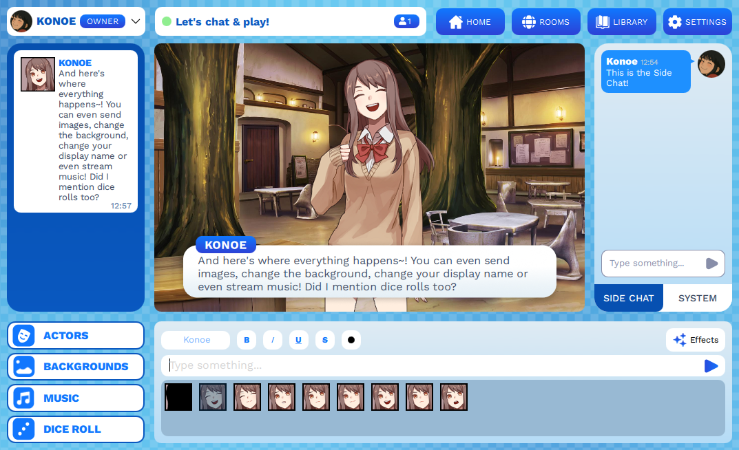 Create your own Actor or use our official ones! It's as easy as jumping in and enjoying a live chat with avatar expressions, custom backgrounds, dice rolls, effects and a myriad of backgrounds to choose from... all of this in customizable rooms YOU can create!
